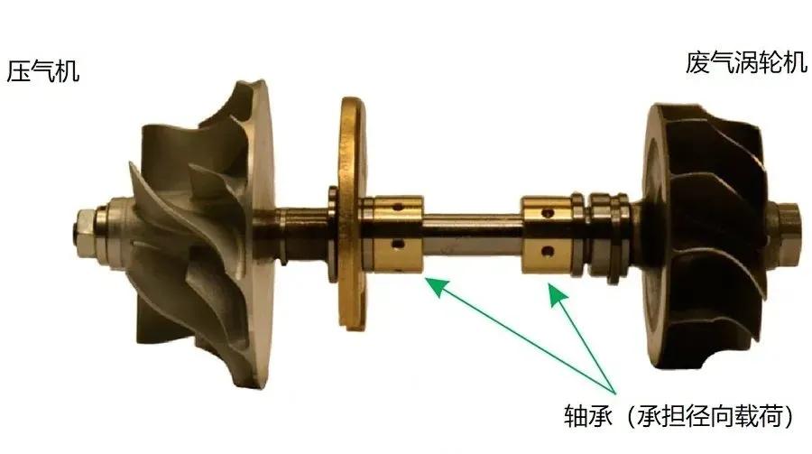 這是渦輪增壓器的轉(zhuǎn)子部分,廢氣渦輪端與壓氣機(jī)端由一根中間軸剛性連接,以一個整體在渦輪增壓器殼體內(nèi)高速旋轉(zhuǎn)。中間軸上安裝有軸承,減少轉(zhuǎn)子轉(zhuǎn)動的阻力,兩個軸承還會共用一套設(shè)有潤滑孔的軸承殼體,以保證機(jī)油能全部流入軸承所在的部位。軸承需要承受動輒每分鐘十幾萬轉(zhuǎn)的工作強度,同時還要忍受高達(dá)700℃以上的溫度。因此,為軸承提供充足的潤滑,是保證渦輪增壓器壽命的重要前提。