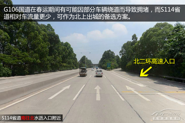 S114省道(廣花一級公路)由于廣清高速及機(jī)場高速的開通,平日行走此路的車并不多。而且此路的紅綠燈遠(yuǎn)比106國道少很多,且不會從龍歸、人和等鎮(zhèn)里穿過,車流量更少。