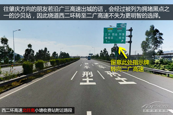 此方案從路況比較好的機(jī)場高速出城,然后繞行北二環(huán)及西二環(huán)高速,最后經(jīng)二廣高速或廣昆高速去往肇慶或賀州。雖然繞行機(jī)場高速等路段會使回家的路程增加一段距離,但可以避開廣佛高速沙貝、橫沙及泌沖等路段的擁堵。