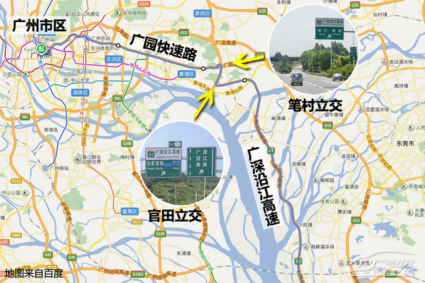 (往深圳方向)方案一:廣園快速路(東行)—(筆村站)東二環(huán)高速—(官田站)廣深沿江高速