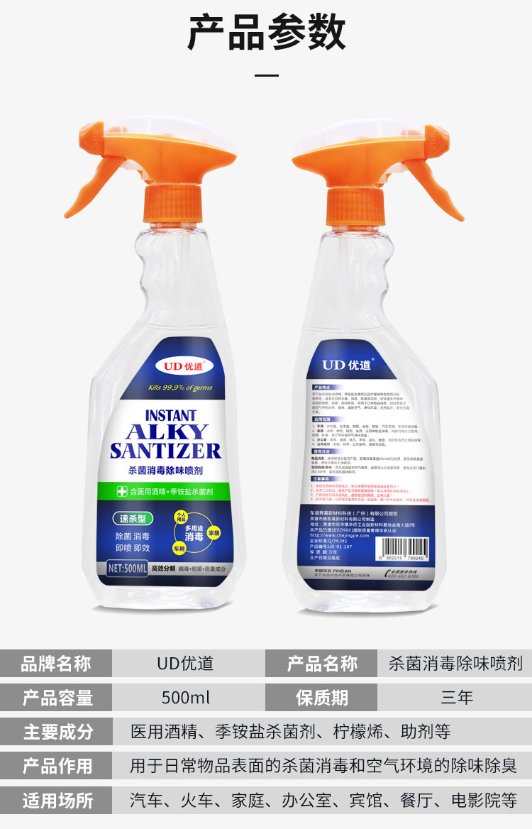 優(yōu)道車內(nèi)殺菌消毒噴劑,采用75%酒精、季銨鹽殺菌劑以及多種納米抗菌劑配制而成,具有優(yōu)異的殺菌、消毒、除臭等功效,可快速殺滅物體表面的細菌、病毒,即噴即效,可用于日常物品消毒;同時有效去除空氣中的異味、臭味,清新空氣,凈化環(huán)境;天然配方,安全無毒無害。
